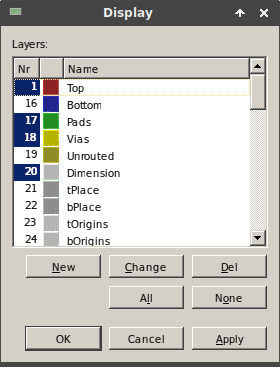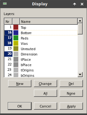 Používáte-li EAGLE, budete se muset potýkat s trochou prehistorického ovládání. Nejprve tedy v editoru plošáků vypněte všechny vrstvy pomocí tlačítka „None“. Pak zapněte vrstvy podle obrázku (platí pro horní vrstvu) přes View → Layer Settings. Případně ještě zapněte vrstvu Holes, ale pak si zkontrolujte, že značka díry nepřekrývá žádné spoje.