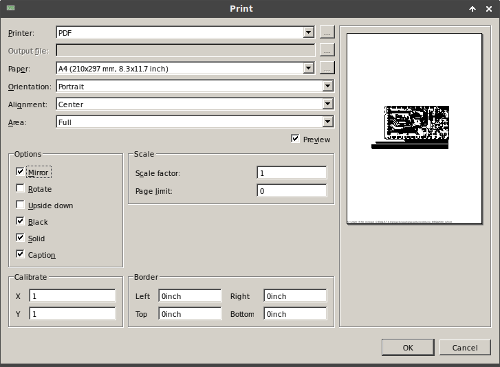 Přes File → Print vyexportujte PDF podle obrázku. Všimněte si zatržítka „Mirror“. Pro horní vrstvu MUSÍ být zaškrtnuté. Pro spodní vrstvu NESMÍ být zaškrtnuté.