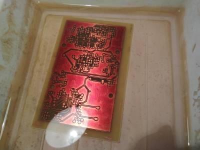 Vyvolává se při pokojové teplotě a chce to trochu cviku, poznat, kdy už je vyvoláno akorát. Místa s odleptaným fotorezistem jsou růžová. Použitý roztok je možné použít znovu, a tak prosím neplýtvejte a nalijte ho zpět do nádobky (kdo to má stále připravovat